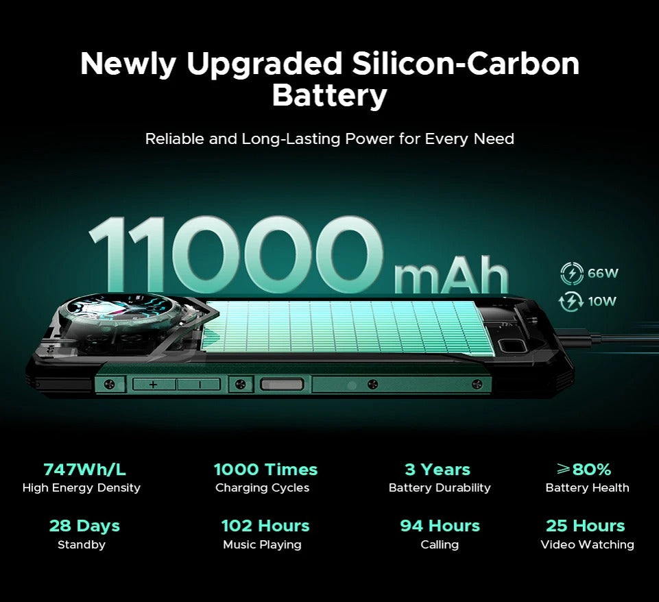 Equipped with a large 11,000 mAh battery and fast charging up to 66 W — ideal for extended use off‑grid.