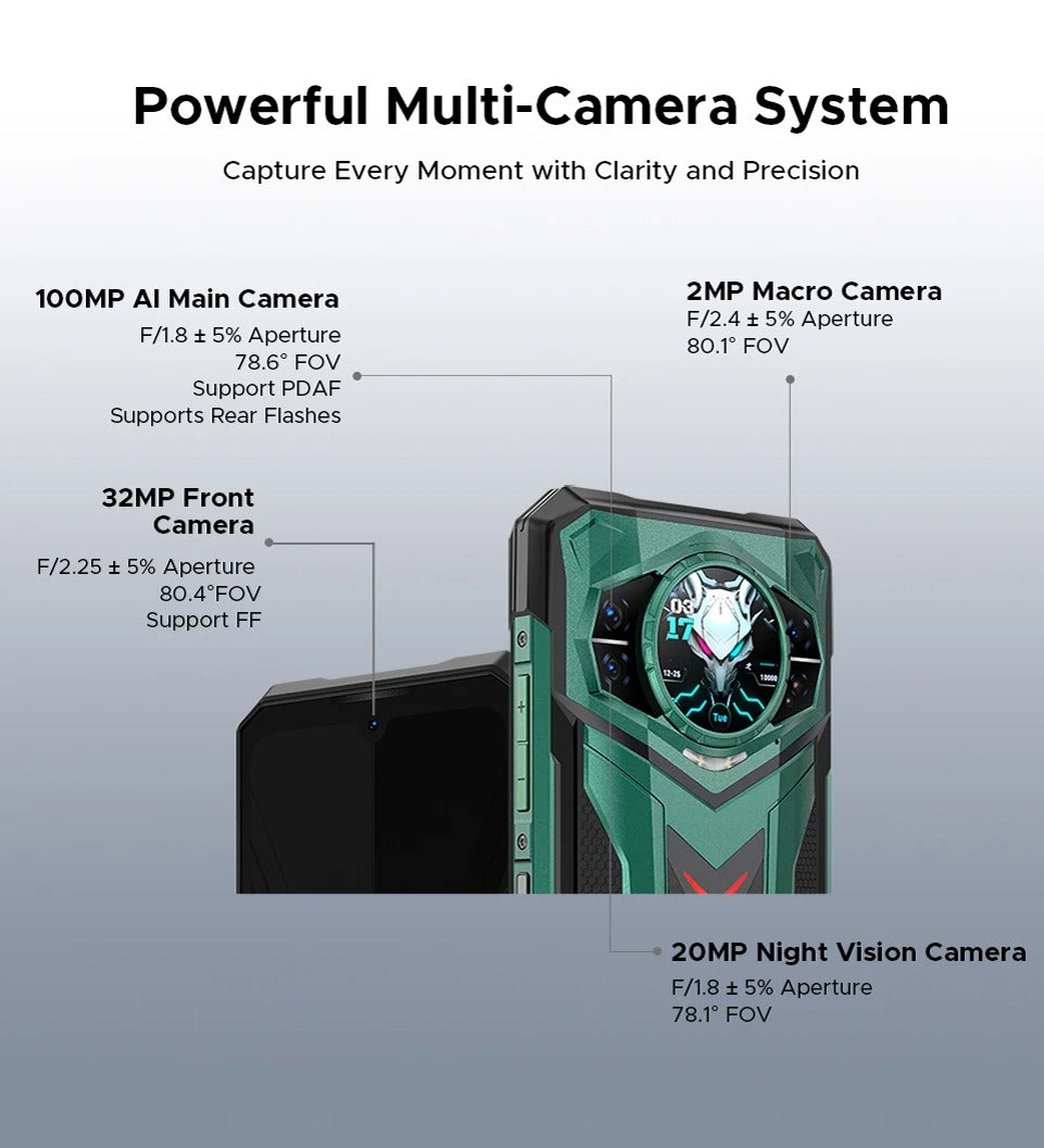Triple‑camera system including a 100 MP main sensor, a 20 MP night‑vision lens and a 2 MP macro lens — plus a 32 MP front camera for selfies.