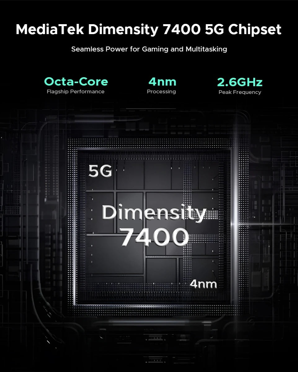 Powered by a MediaTek Dimensity 7400 chipset and configured for smooth performance with up to 12 GB (or more) RAM and generous storage.
