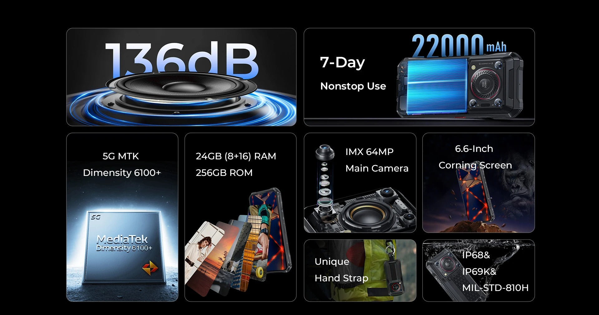 Oukitel WP33 Pro 5G Rugged Phone 136dB Loudspeaker 22000mAh 6.6-inch FHD+(24GB+256GB NFC) - Rugged Phones Only